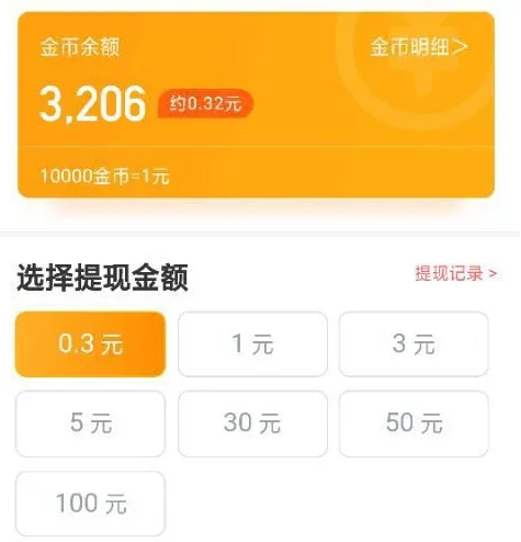 4、最后金币月达到提现的要求就可以进行提现了,10000金币=1元,最低0.3元提现
