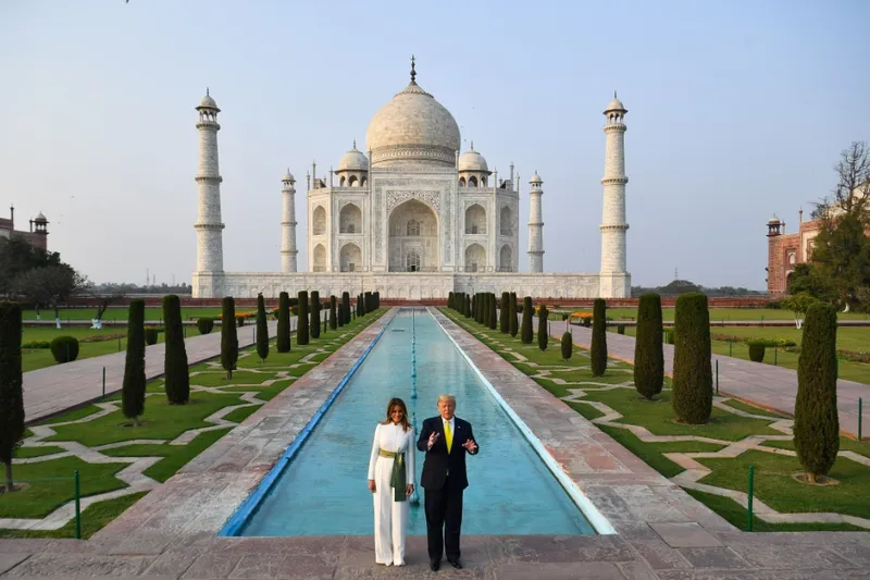 2月24日,在印度阿格拉,美国总统特朗普(右)与夫人梅拉尼娅在泰姬陵前合影。 新华社 图