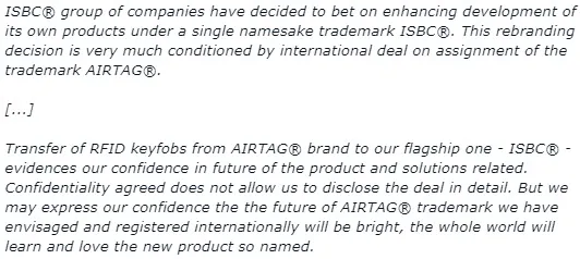 据RBC报道称,一个自称为“俄罗斯领先的智能卡和RFID标签制造商”的名为ISBC的组织最近向苹果出售了“AirTag”商标,下面是购买协议的一部分,另据熟悉交易细节的消息人士表示,该协议将让ISBC智能以单一品牌开发产品。
