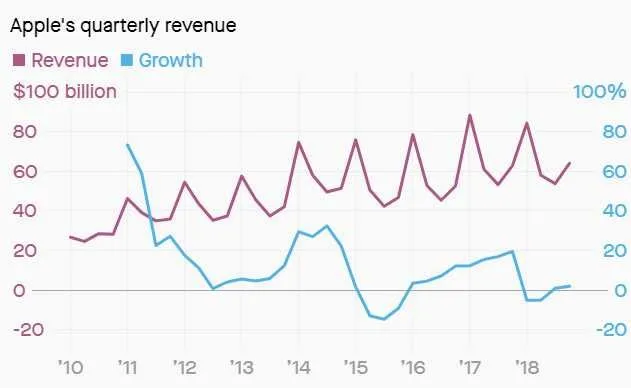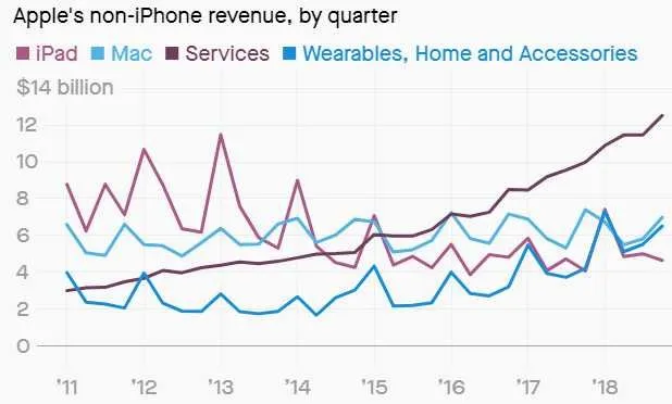 多年来,苹果的摇钱树一直是iPhone,iPhone能占到季度营收的三分之二。但是,由于智能手机市场日趋饱和,消费者换机周期延长,最近iPhone业务营收出现滑坡。第三季度iPhone业务营收下跌幅度超过9%,这使得苹果营收超过分析师预期显得更难能可贵。推动苹果营收增长的两个主要因素是服务和配件。