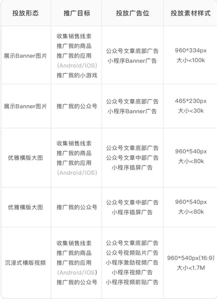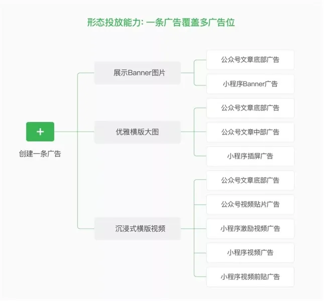 公众平台广告按形态投放能力支持公众号及小程序流量的所有广告位,包括公众号文章底部广告、文章中部广告、公众号视频贴片广告、小程序Banner广告、小程序激励视频广告、小程序插屏广告、小程序视频广告和小程序视频前贴广告8个广告位。