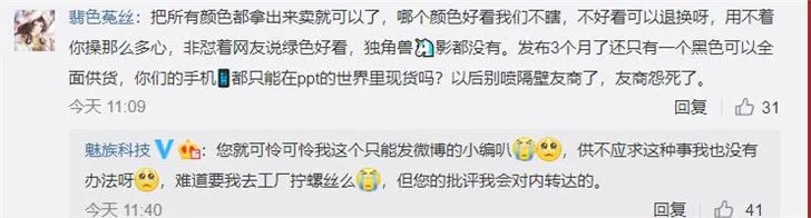有网友对这个声明提出质疑,称“那货呢”,言下之意你们没停产怎么就买不到货呢?魅族科技则表示正在生产中,“供不应求这种事我也没有办法呀,难道要我去工厂拧螺丝么,但您的批评我会对内转达的。”