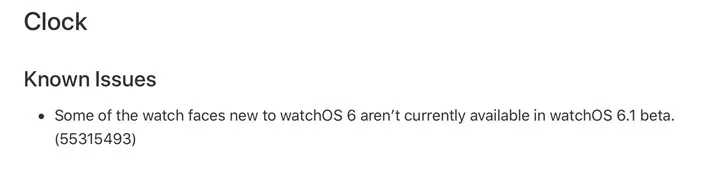 苹果指出,watchOS 6.1开发者预览版Beta 1暂时缺少了watchOS 6的部分新表盘。