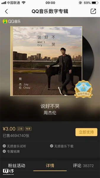 IT之家发现,周杰伦新歌《说好不哭》在QQ音乐上显示独家,专辑售价3元,需单独购买,评价近4万。《说好不哭》目前主要登陆腾讯音乐娱乐集团旗下平台,包括QQ音乐、酷狗音乐、酷我音乐等。