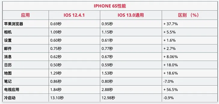 测试中,在这两款旧手机上运行iOS 13基本都比运行iOS 12要慢,当然,其中有很多只是0.0几秒区别,性能几乎达到平均水平。一些区别看起来很大的运行项,是因为基准时间本来就很短因此百分比被拉大(比如Safari和TV),但实际上用起来你不会有太大感觉。