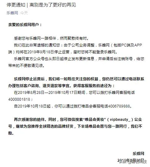 就在今日,乐蜂传来了噩耗:将于下个月,9月18日停止运营。