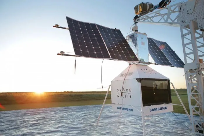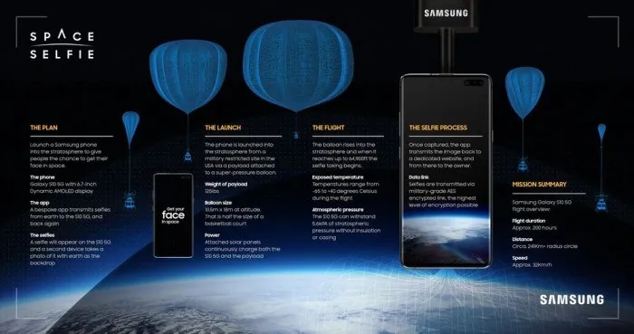 据悉三星计划在美国南达科他州的发射平台起飞,使用半个篮球场大小(10.5m x 18m)的高压气球将Galaxy S10 5G送到20公里的高空。这款特殊的底座经过精心设计,可确保拍摄出最佳质量的照片,同时其太阳能为底座和Galaxy S10 5G供电。
