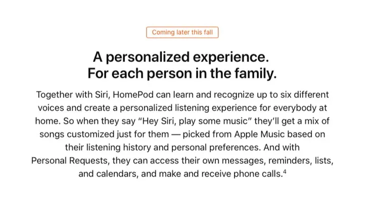 伴随着一大波新品的发布,苹果本周也悄然更新了官网的HomePod产品页面,宣布将于近期为该智能扬声器添加一些新的功能。