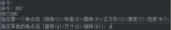 4、点击CAD软件界面的任意一处后,指定第二个角点。在这里,我们选择面积(A),输入A,按空格键。
