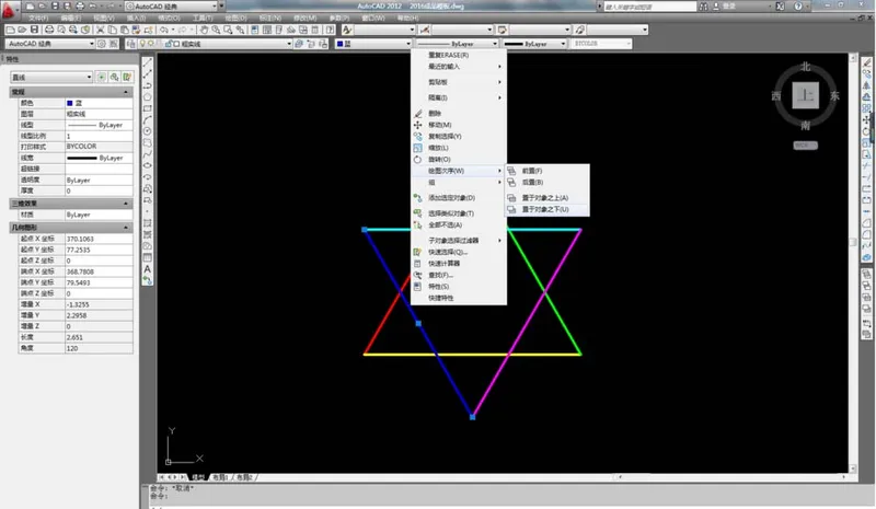 5.点击鼠标选中蓝色线段,再单击鼠标右键,在弹出的菜单栏中依次点击【绘图次序】-【置于对象之下】,如图所示。