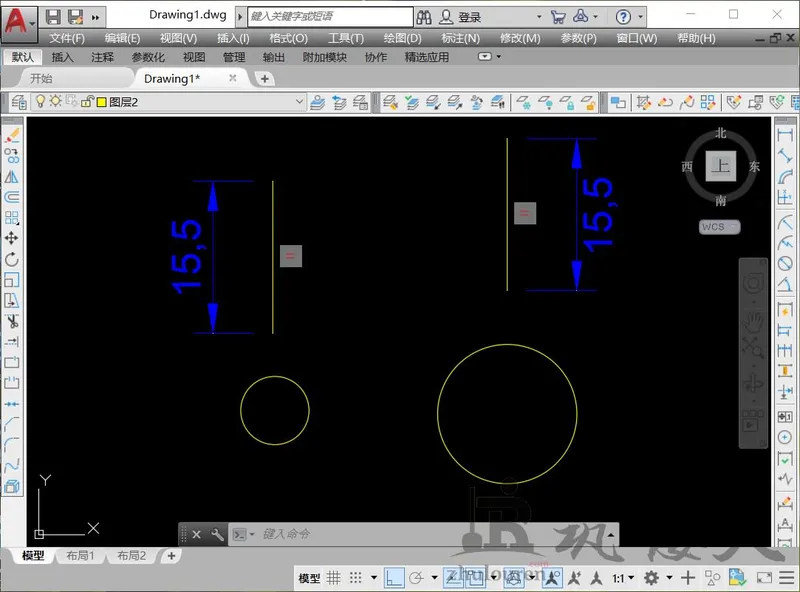 5.重复命令将选择两个圆形作为相等约束的对象,命令完成后,两个圆的半径相等,如图所示。