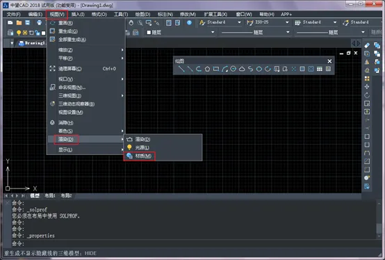 菜单栏:打开CAD,如下图所示,在顶部菜单栏选择【视图】——【渲染】——【材质】。