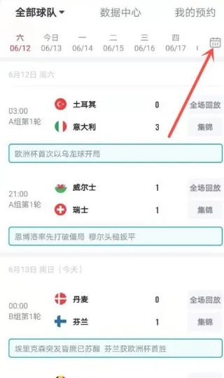 进入欧洲杯专题页面,点击右上角【日历】图标。